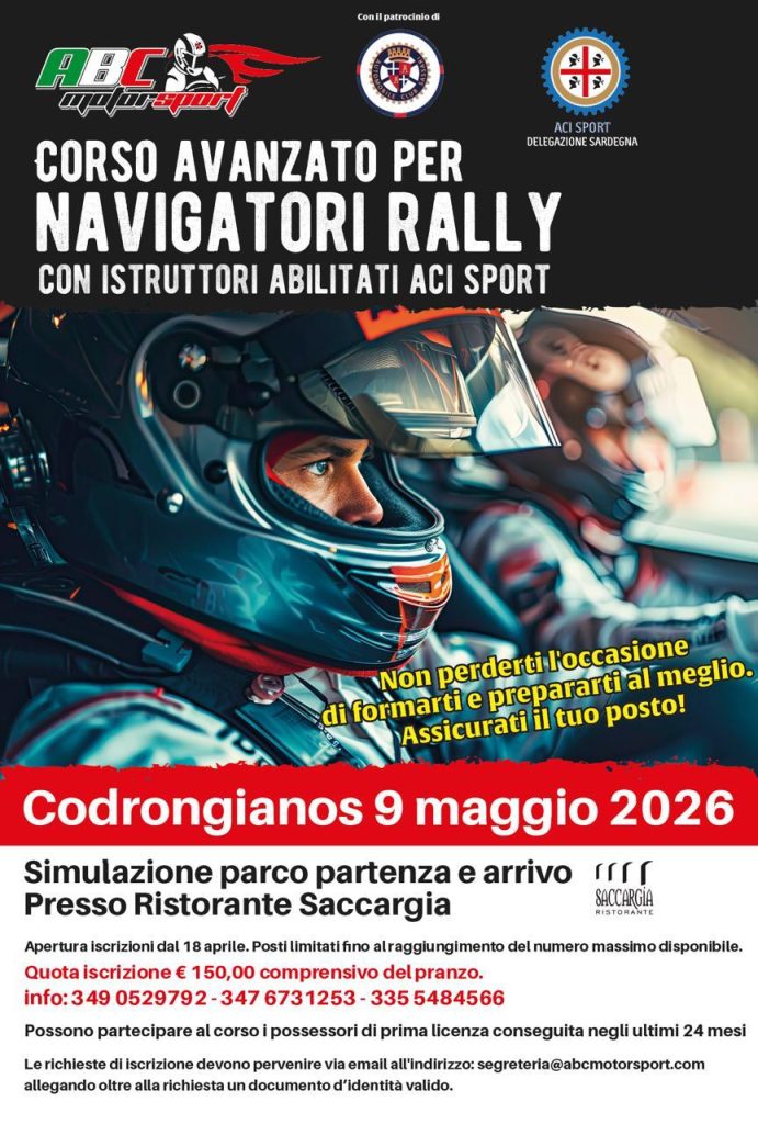 ABC Motor Sport organizza una giornata di alta formazione tecnica dedicata al ruolo di navigatore in ottica del prossimo Rally Golfo dell’Asinara. Possono partecipare al corso i possessori di prima licenza conseguita negli ultimi 24 mesi.