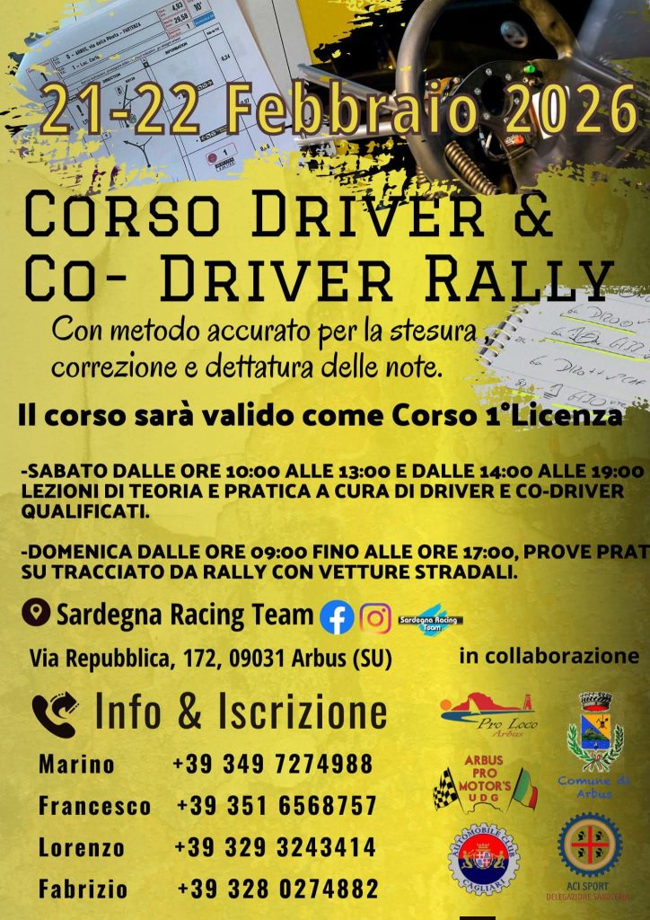 In programma 21–22 febbraio 2026, ad Arbus, il Corso Driver & Co-Driver Rally, valido come Corso di Prima Licenza ACI